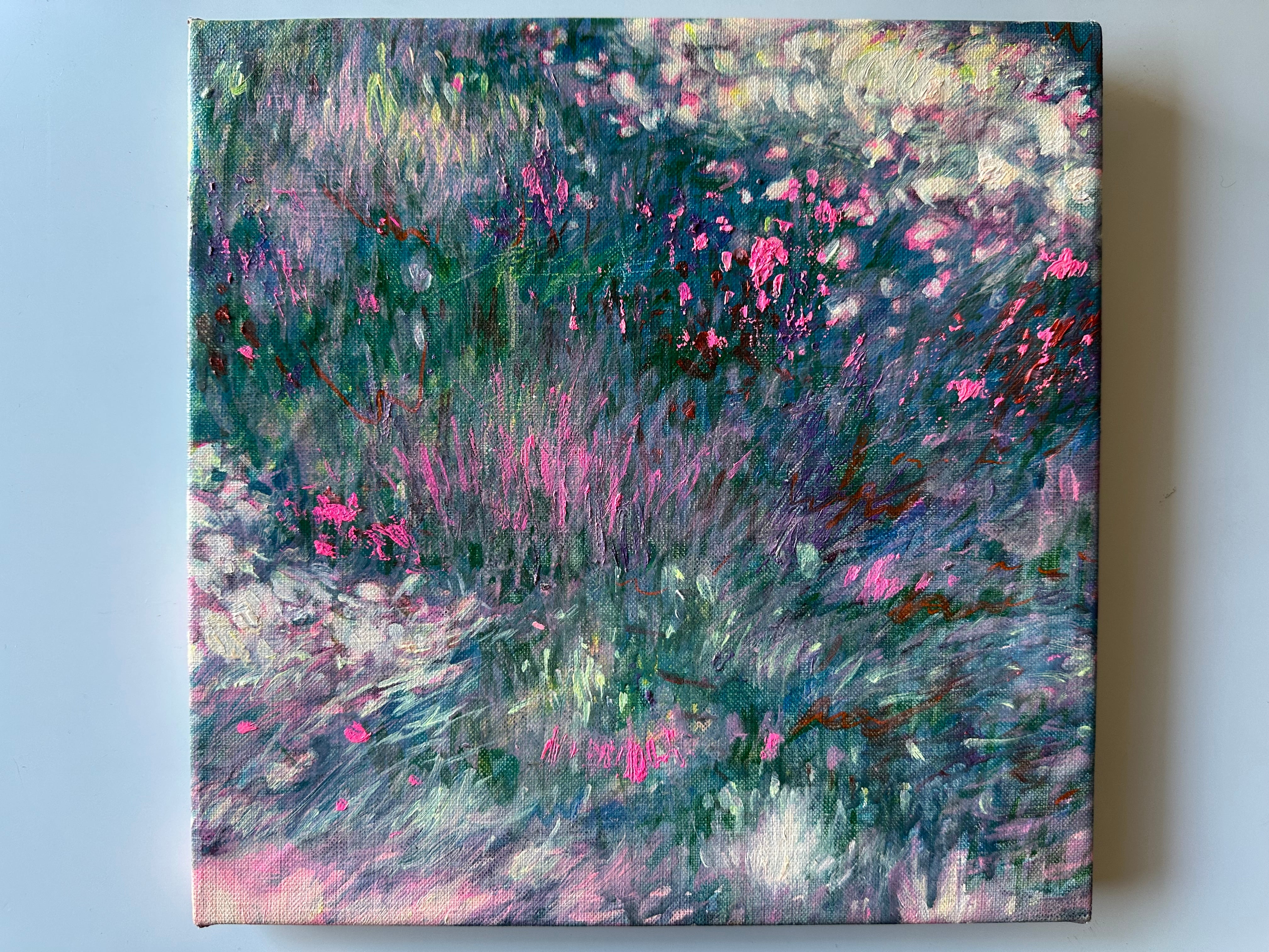 自然の持つ線や空間の美しさを抽出して自由に色を響きあわせるようにして抽象画を描いています。